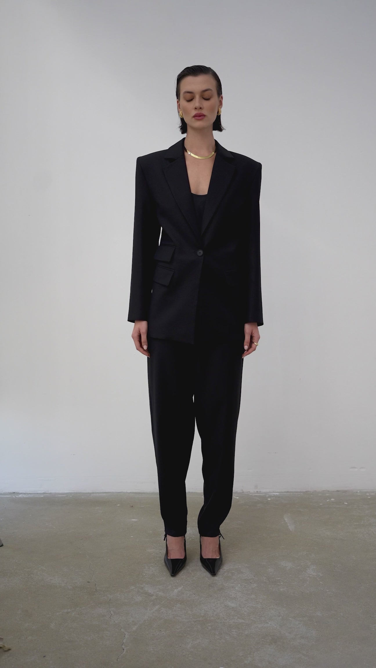 Szerokie długie klapy, zapięcie na jeden guzik, podwójna asymetryczna patka i niepowtarzalna konstrukcja na plecach sprawiają, że nie jest to zwykła czarna marynarka.