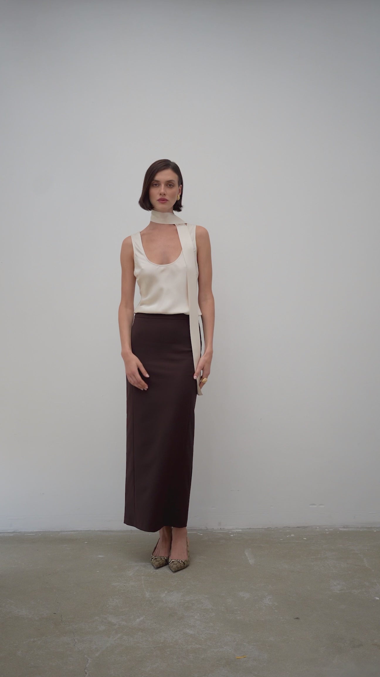 Top uszyty z lekkiej, ale mięsistej tkaniny z delikatnym, satynowym połyskiem w kolorze złamanej bieli. W zestawie z krawatką, którą nosić możesz na różne sposoby (krawatka nie jest trwale przyszyta do topu). Owalny dekolt, szersze ramiączka, oraz lekka forma sprawia, że top możesz nosić z bielizną lub bez.